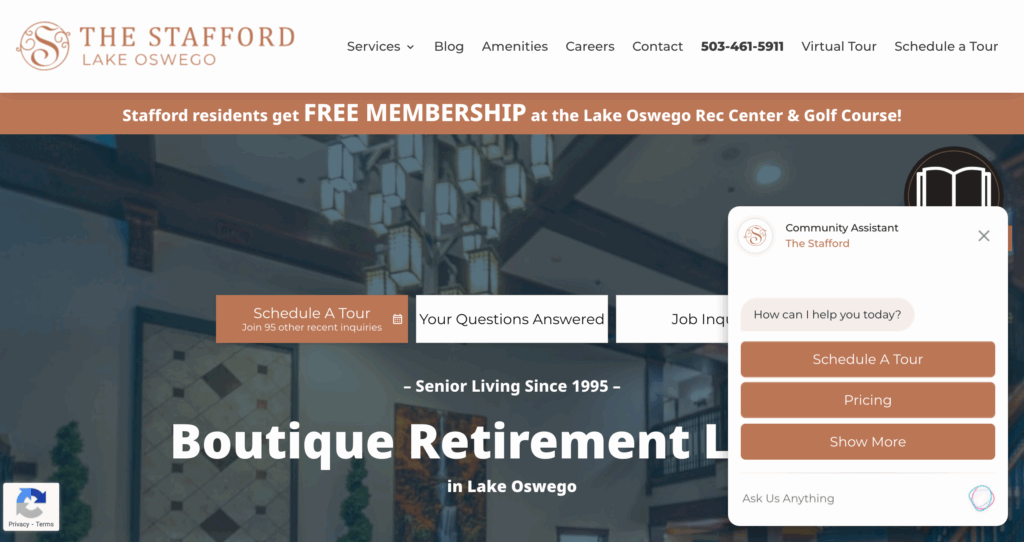 In Lake Oswego near Portland, The Stafford offers upscale independent living with elegant designs. Activities range from golf to classes. The suburban peace appeals. Some find it polished but formal.