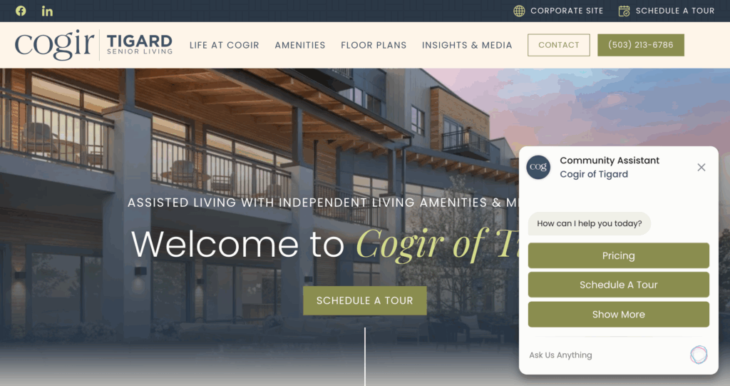 Cogir of Tigard, by Cogir, near Portland, features new builds with gyms and theaters. It’s for active types. Based in Scottsdale, AZ. Residents love facilities, but location is suburban.